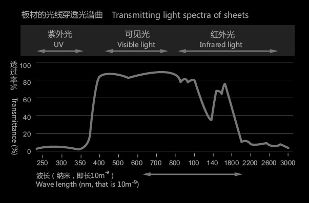 下圖為陽光板的透光光譜圖,從圖上可以看出,波長(zhǎng)短于350nm的紫外線幾乎不穿透陽光板。
